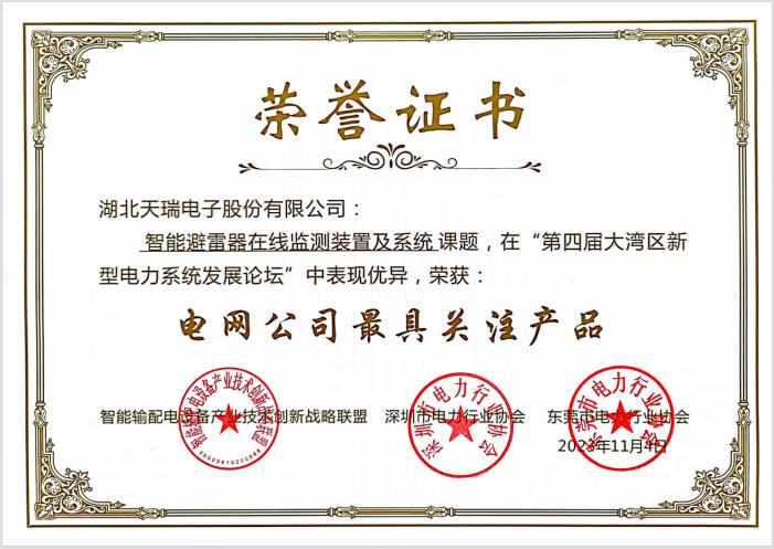 同时天瑞电子公司“TR-ICM-10型避雷器在线监测装置及系统”在第四届大湾区新型电力系统发展论坛中获得“电网公司最具关注产品”。